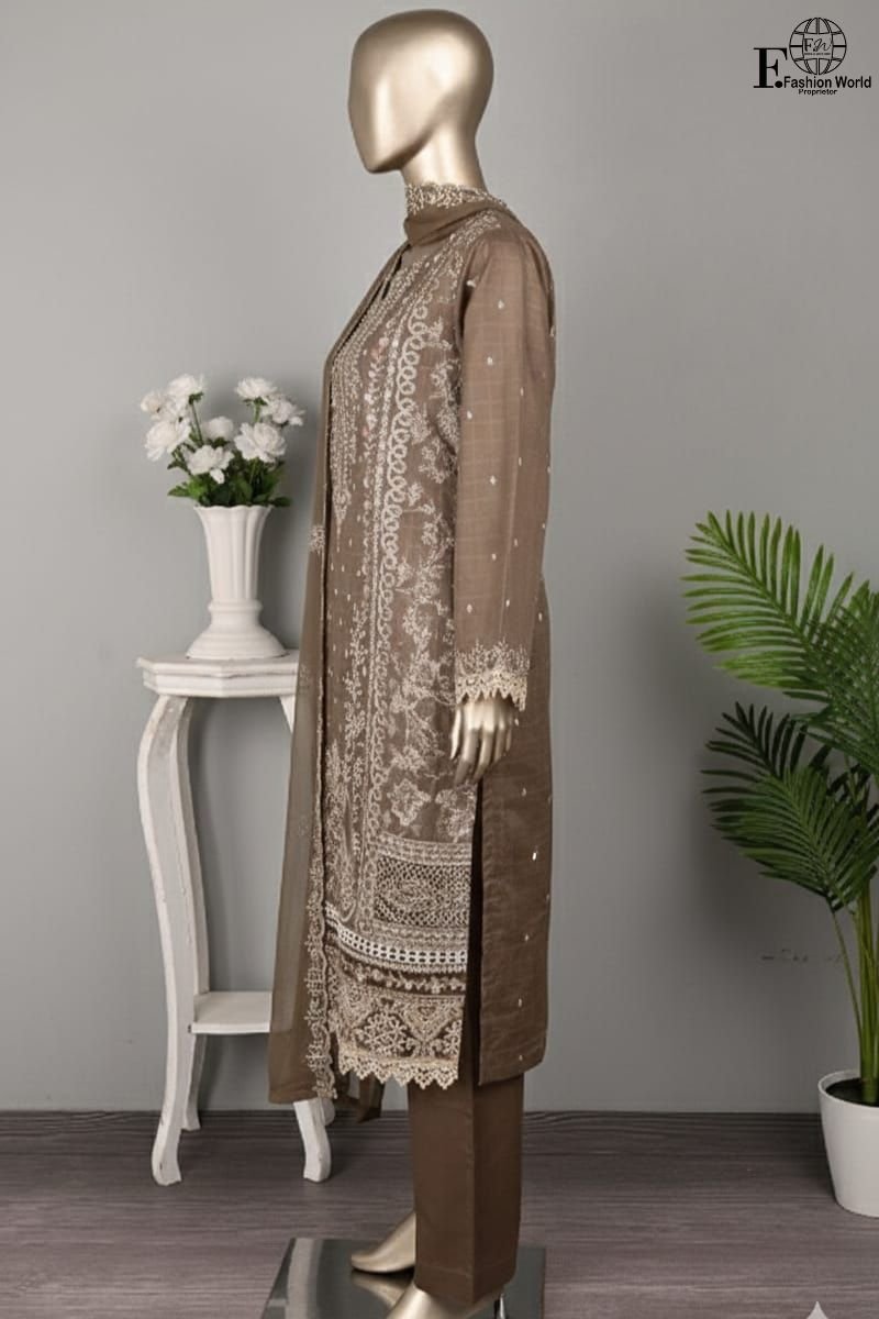Step into timeless elegance with this beautifully crafted unstitched 3-piece ensemble from the Serafina collection. Inspired by classic eastern artistry, this outfit blends intricate embroidery with a graceful peach tone — perfect for festive evenings, formal gatherings, and special occasions.