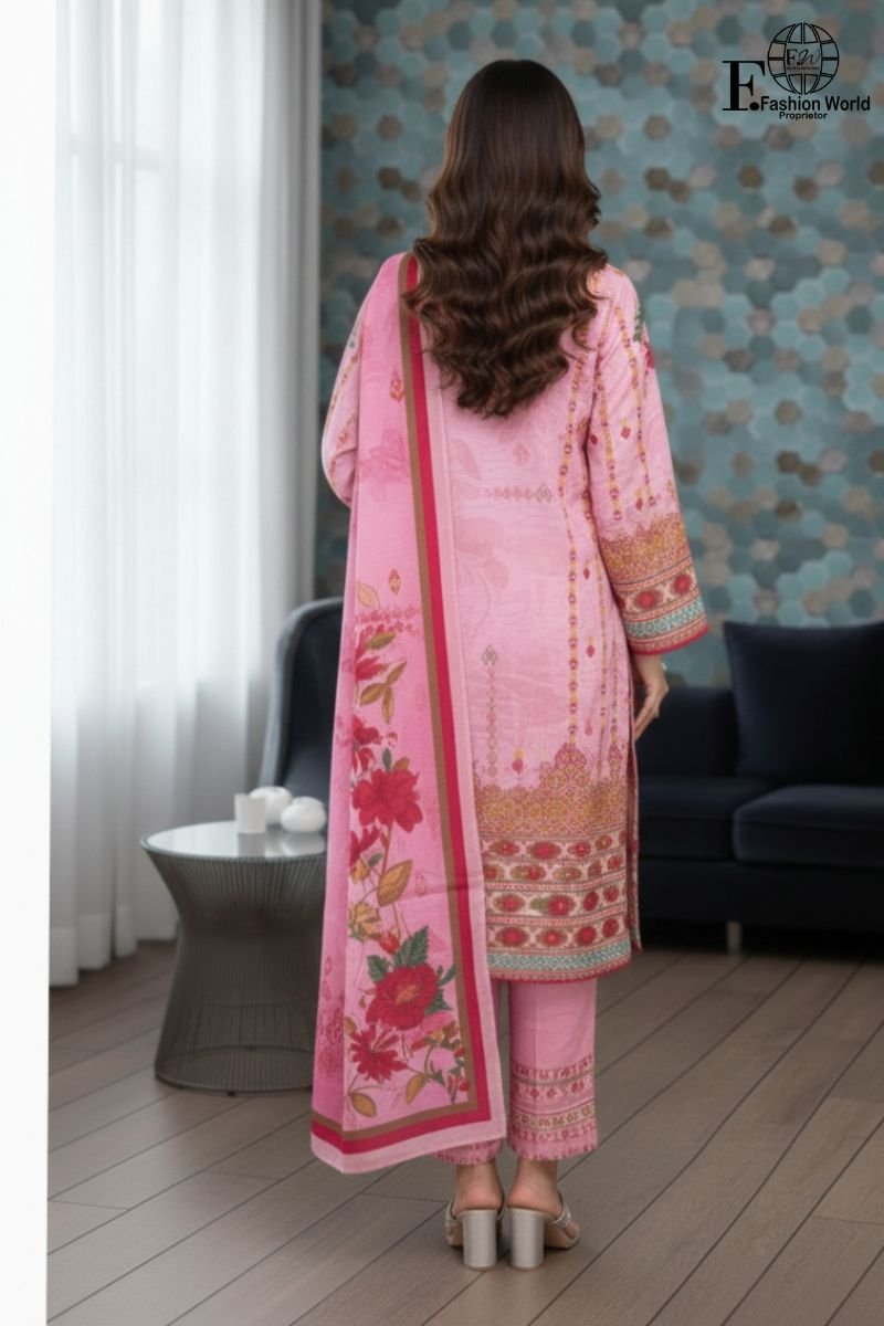 Refresh your wardrobe with Fashion World’s Digital Printed Embroidered Lawn 3-Piece Unstitched Suit, designed for women who love modern prints paired with subtle embroidery.